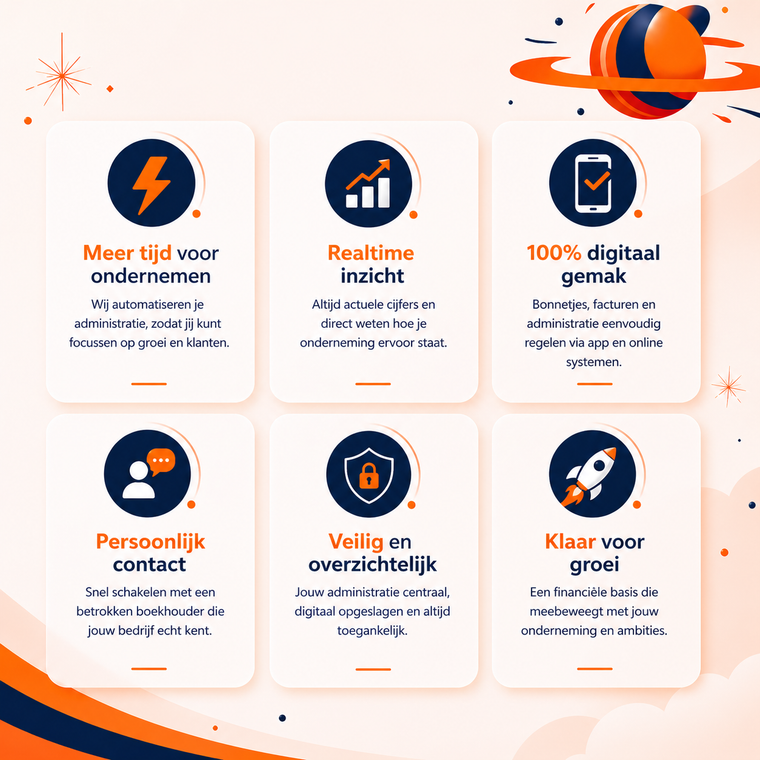 Met deze manier van werken ontstaat er rust en overzicht. Je weet dat je administratie goed geregeld is en je hebt altijd inzicht in de financiële situatie van je onderneming. Dit geeft je de ruimte om je te focussen op wat echt belangrijk is: ondernemen, groeien en kansen benutten. Tegelijkertijd sta je er niet alleen voor. Wij blijven betrokken en denken actief met je mee, zodat je niet alleen inzicht hebt, maar dit ook kunt vertalen naar concrete keuzes en stappen.